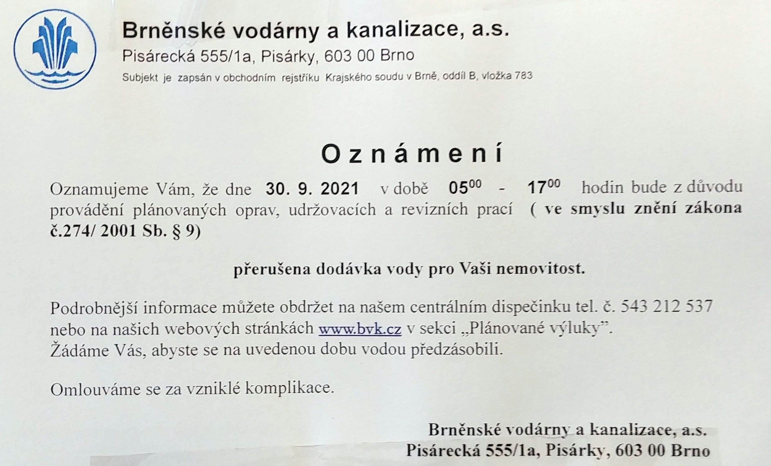 Z důvodu havárie na přívodu studené vody do bloků Mutěnická 9, 11 a 13 a její opravy nepoteče ve dnech 9., 14. a 17. 9. v době od 8 - 16 hod. studená voda. Jelikož nebudou objednávány náhradní cisterny s vodou ani pro jeden vchod, žádáme bydlící v domě Mutěnická 9, aby s tímto počítali a studenou vodou se na dobu opravy předzásobili.